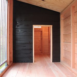 Het frame van de kennel is gemaakt van behandeld en geïmpregneerd hout. Deze houtsoort is perfect bestand tegen verschillende weersinvloeden. De buitenzijde is afgewerkt met zwarte potdekseldelen en voorzien van Douglas houten accenten, wat zorgt voor een sfeervol totaalplaatje.