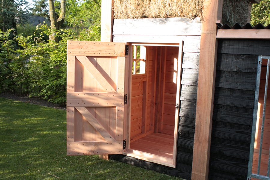 EcoWoods beschikt over een eigen houtzagerij waar de robuuste hondenkennel hooiberg in elke gewenste maat gemaakt kan worden.