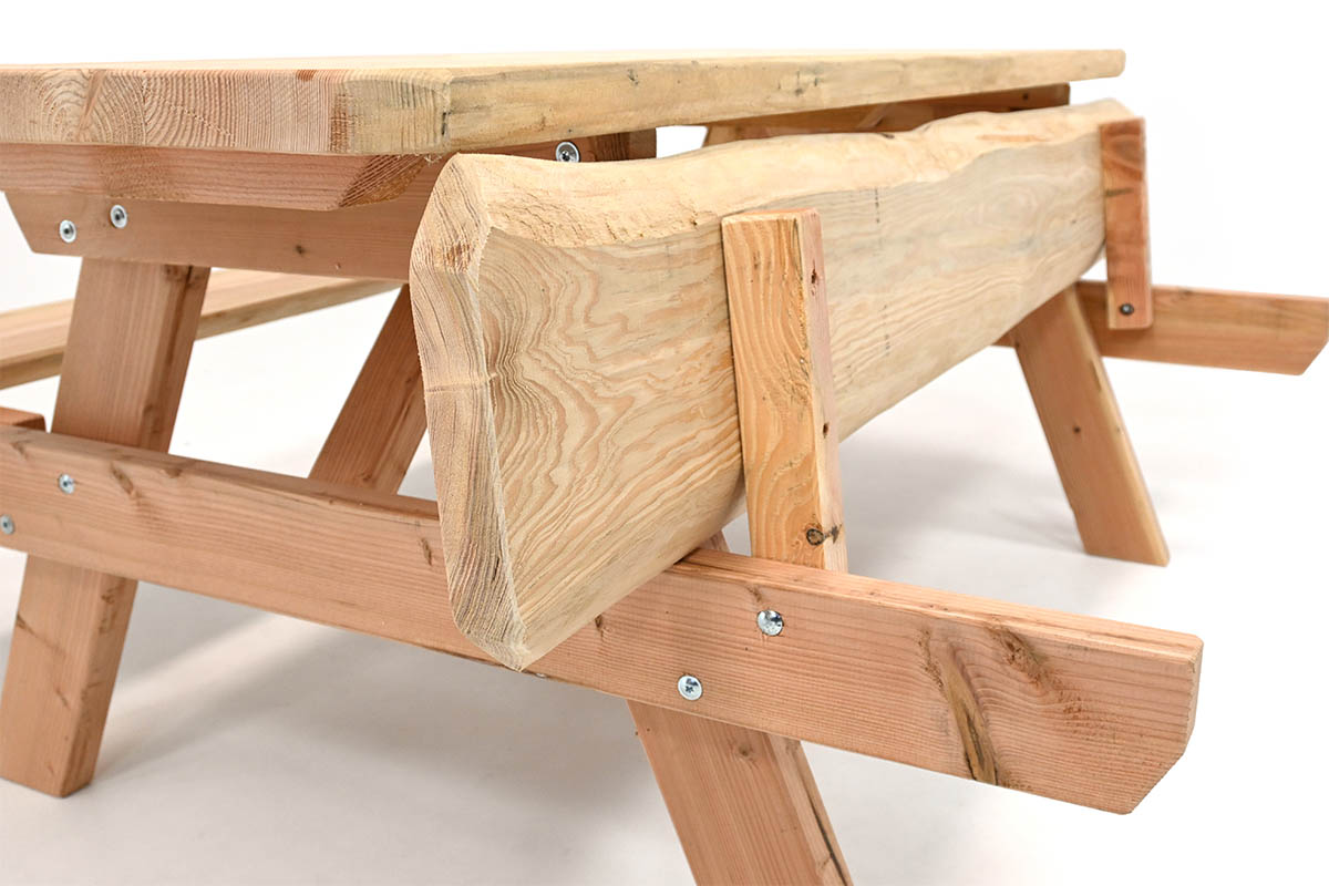 De robuuste picknicktafel Natuur is gemaakt met de natuurlijke vormen van de douglas boomstam. Een stevige, verplaatsbare douglas picknicktafel met opklapbare zittingen. Ook verkrijgbaar in eiken.
